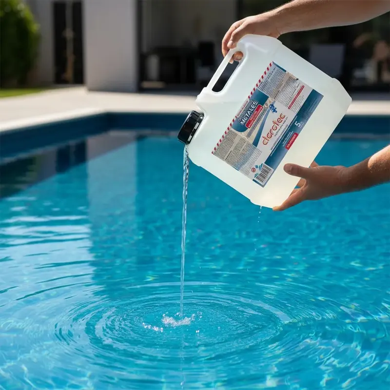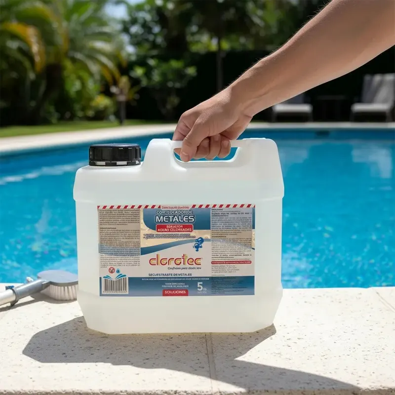 Con el agua equilibrada, antes de desinfectar con cloro, aplicar el controlador de metales Clorotec a razón de 150cc cada 10 m3 (10.000 litros). Colocar el equipo de filtrado en recirculación por al menos 1 hora para ayudar a distribuir el producto.