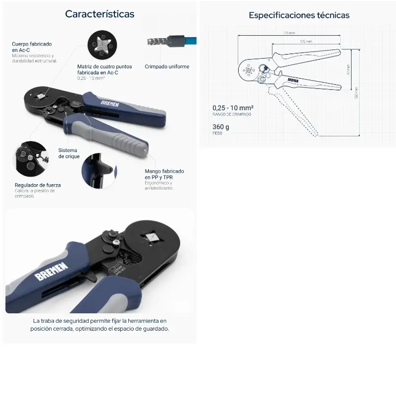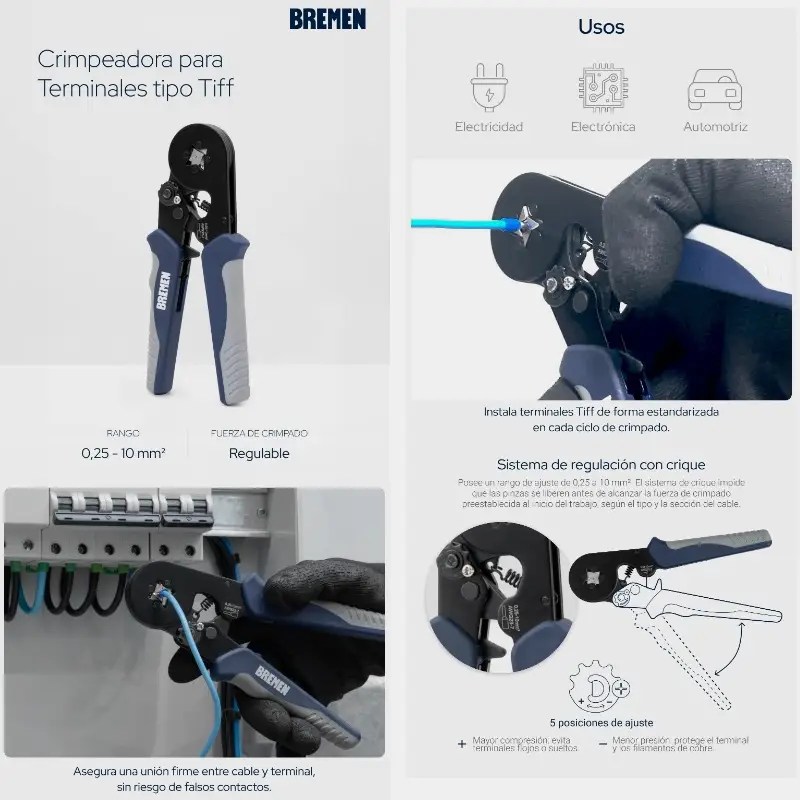 Uniones firmes y sin riesgo de falsos contactos en un rango de 0,25 a 10 mm². Su mecanismo de crique con fuerza regulable permite estandarizar la presión para lograr los mismos resultados en cada ciclo de trabajo.