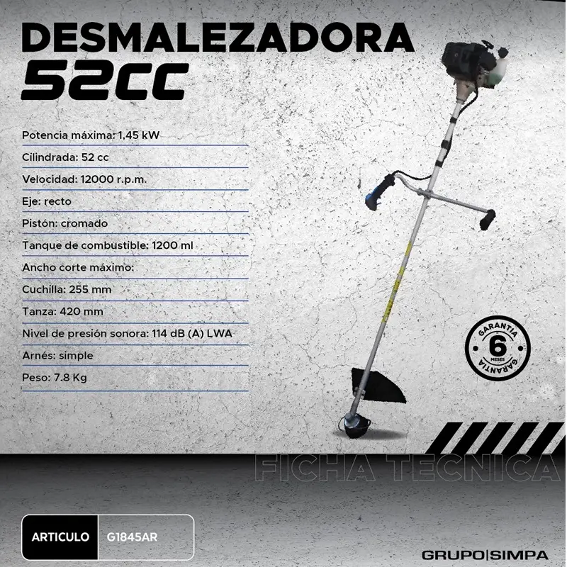 Equipada con un motor naftero de 2 tiempos de 1,45Kw, arranque manual, a cordel retráctil y una velocidad de hasta 12000 rpm. Esta máquina ofrece un corte eficiente incluso en maleza densa y resistente.