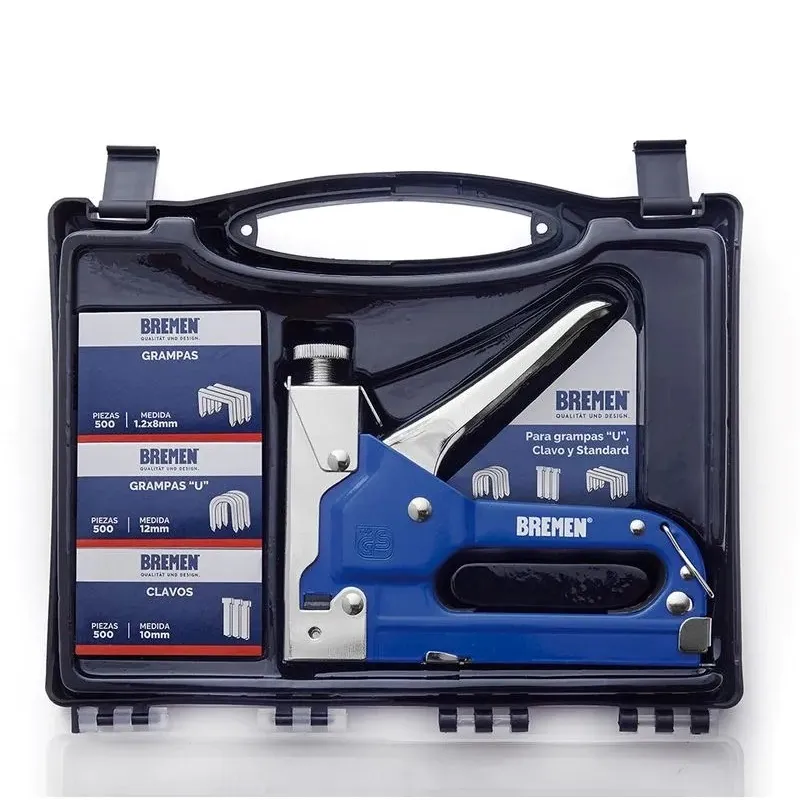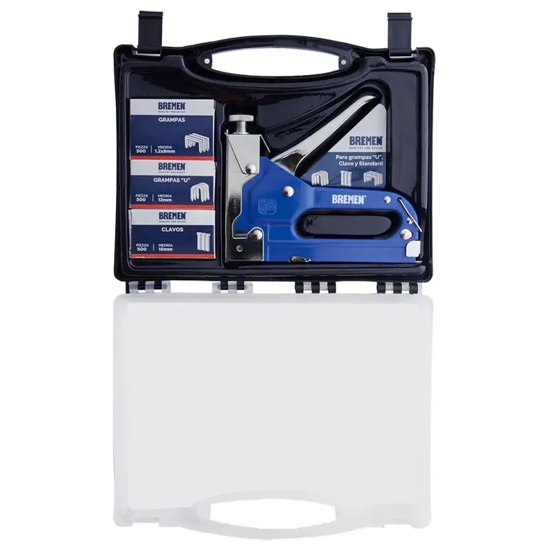 Fabricada en metal de alta resistencia con capacidad para grampas estándar, tipo «U» y clavos. Es compatible con sistemas Rapid y Arrow, garantizando versatilidad técnica. El set incluye maletín plástico y insumos, ideal para trabajos que requieren máxima durabilidad y precisión.