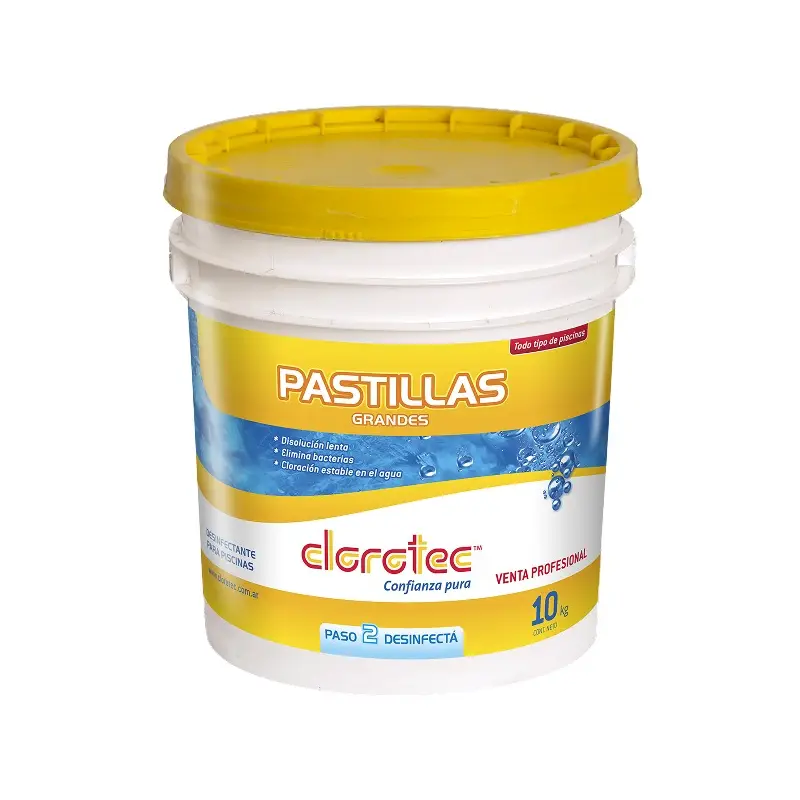 Cloro en pastillas de disolución lenta que actúa como desinfectante. Contiene pastillas de 200g cada una. Se colocan en la boya o en el skimmer de la piscina para una disolución pareja y prolongada. Apto para todo tipo de piletas